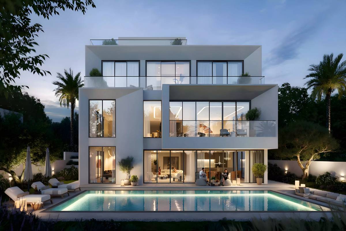 The villa features architectural brilliance, fusing contemporary elegance with natural elements (glass, stone, wood) to create an advanced, inviting appeal. Varying in size from 7,287 to an expansive 12,859 SQ. FT. (BUA), each particular villa is masterfully crafted with soaring ceilings, open-plan living areas, floor-to-ceiling windows, and includes a private pool, a maid’s room, a double-height foyer, and internal lift access. positioned in Dubailand, between Arabian Ranches and Expo City, this is a Freehold property with an estimated completion plus handover date of Q3 – 2029 (September 2029).